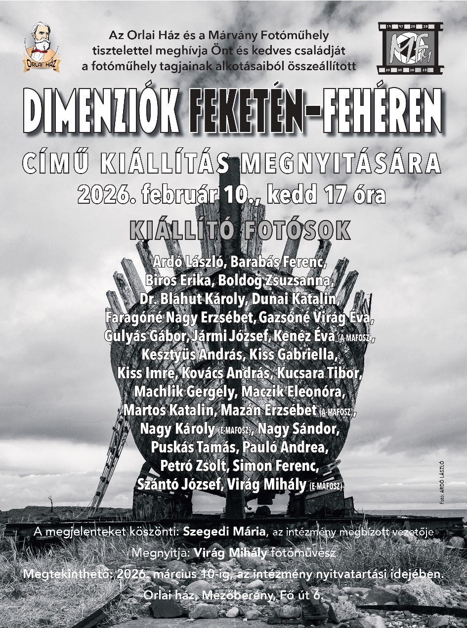 Orlai ház Fő út 6., Mezőberény, MagyarországAz Orlai ház és a Márvány Fotóműhely szervezésében Dimenziók feketén-fehéren címmel kiállítás nyílik február 10-én. Helyszín: Orlai ház (Mezőberény, Fő út 6.) Kiállításmegnyitó: 2026. 02. 10. 17:00 Megnyitja: Virág Mihály fotóművész Megtekinthető: 2025. március 10-ig az intézmény nyitvatartási idejében A kiállítás megtekintése ingyenes!